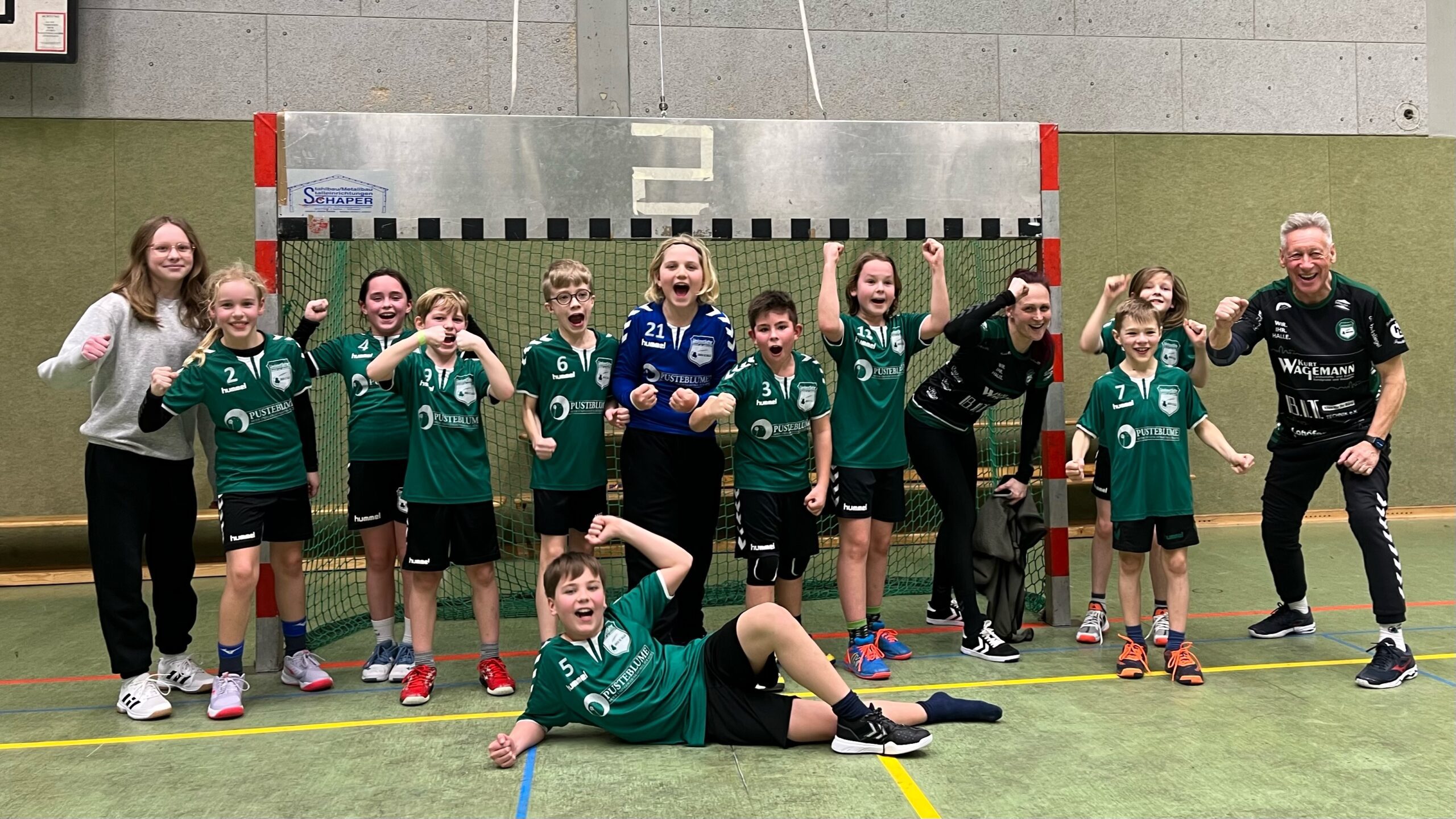 Derby-Time: Unter der Woche stand noch das Nachholspiel gegen die gemischte E1 der TG Hörste an. In einem tollen Handballspiel von beiden Mannschaften wurde um jeden Ball gekämpft. Nach einer schnellen 4:0 Führung unserer Mannschaft konnte die TG Hörste im Laufe der ersten Halbzeit ausgleichen. Allerdings blieben wir im Laufe des Spiels immer im Vorteil. Auf der gut gefüllten Tribüne wurden beide Mannschaften lautstark angefeuert. Zum Schluss stand ein 24:22 Erfolg für unser Team zu Buche. Alle freuen sich schon auf das Rückspiel am 19. März. Das Bild oben zeigt die siegreiche Mannschaft unserer gemischten E nach dem Spiel gegen Hörste.